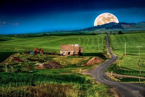 Springtime is magical in the Palouse region of Washington State. The wheat turns a beautiful green and you can a patch work of luscious green wheat fields and fields being prepared for planting. In this case the magic of the area is enhanced with a full moon rising to the east at the end of the road. This image was captured near Kamiak Butte in Whitman County.
